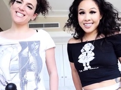 Sexy brunette lesbian riding a big strapon